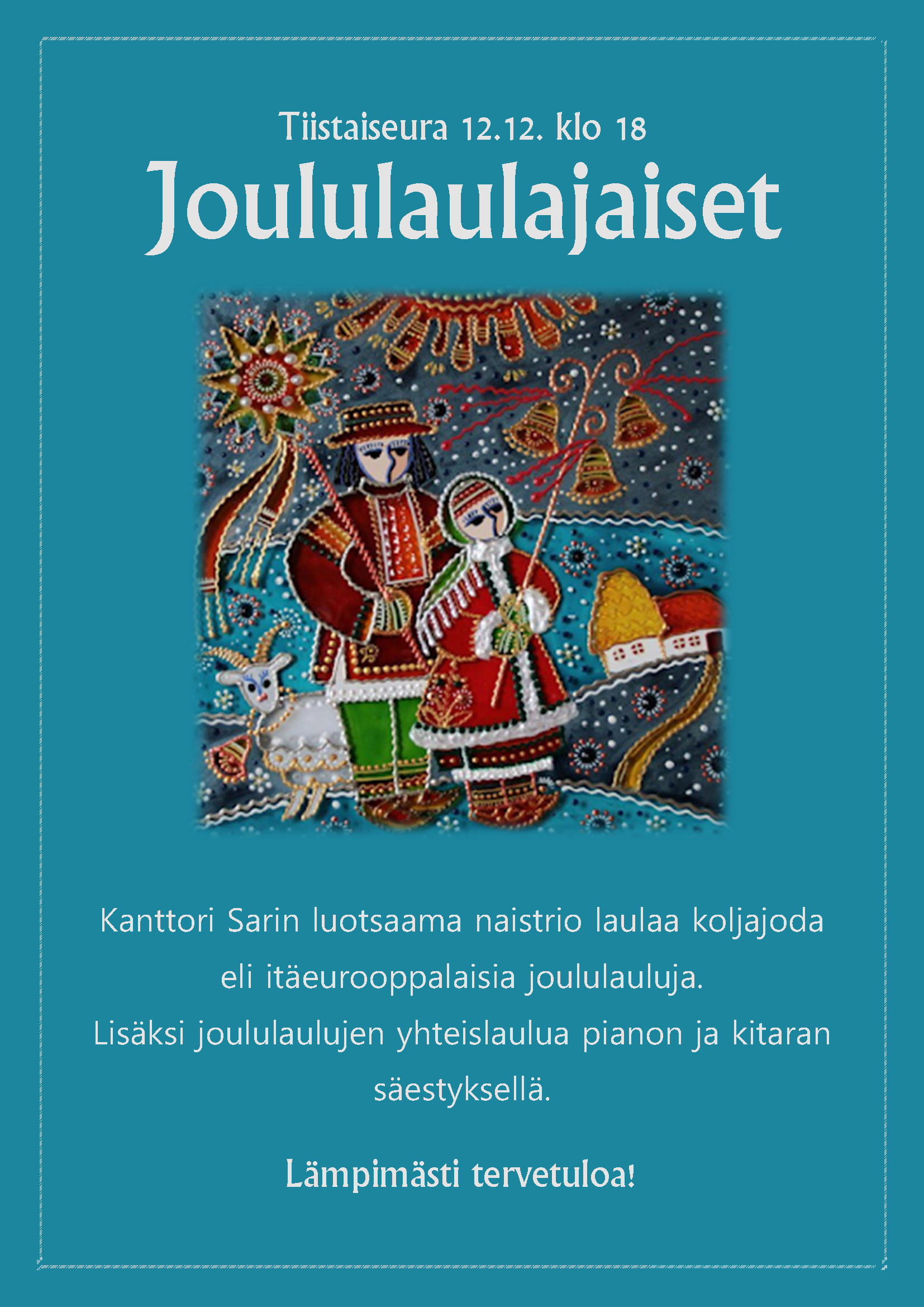 Tiistaiseuraillassa 12.12. joululaulajaiset Tiistaiseuraillassa 12.12. joululaulajaiset Kanttori Sari Ahposen luotsaama naistrio esittää koljadoja eli itäeurooppalaisia joululauluja. Lisäksi joululaulujen yhteislaulua pianon ja kitaran säestyksellä. Tervetuloa! 7 joulukuun, 2023 Uncategorized Comments are closed Porin Seudun Tiistaiseura